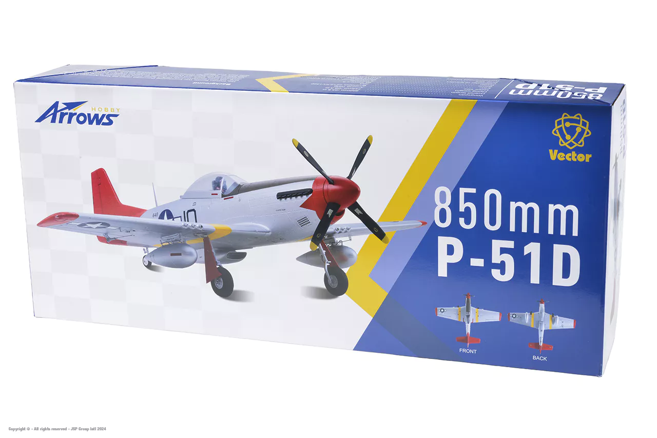 The Arrows P-51D Mustang 850mm combines authentic detailing with cutting-edge performance to honor the legendary P-51 fighter. Its two-piece wing and reinforced structure ensure exceptional stability at high speeds, while the factory-installed 2212 KV1300 motor and four-blade propeller provide versatile power for both casual flights and intense aerial maneuvers. Constructed from durable EPO 40 foam and coated with a weather-resistant finish, it boasts stunning aesthetics and impressive resilience. Whether for relaxed takeoffs or thrilling missions, the Arrows P-51D Mustang is primed for action, delivering an unrivaled flight experience as this legend comes alive just for you!